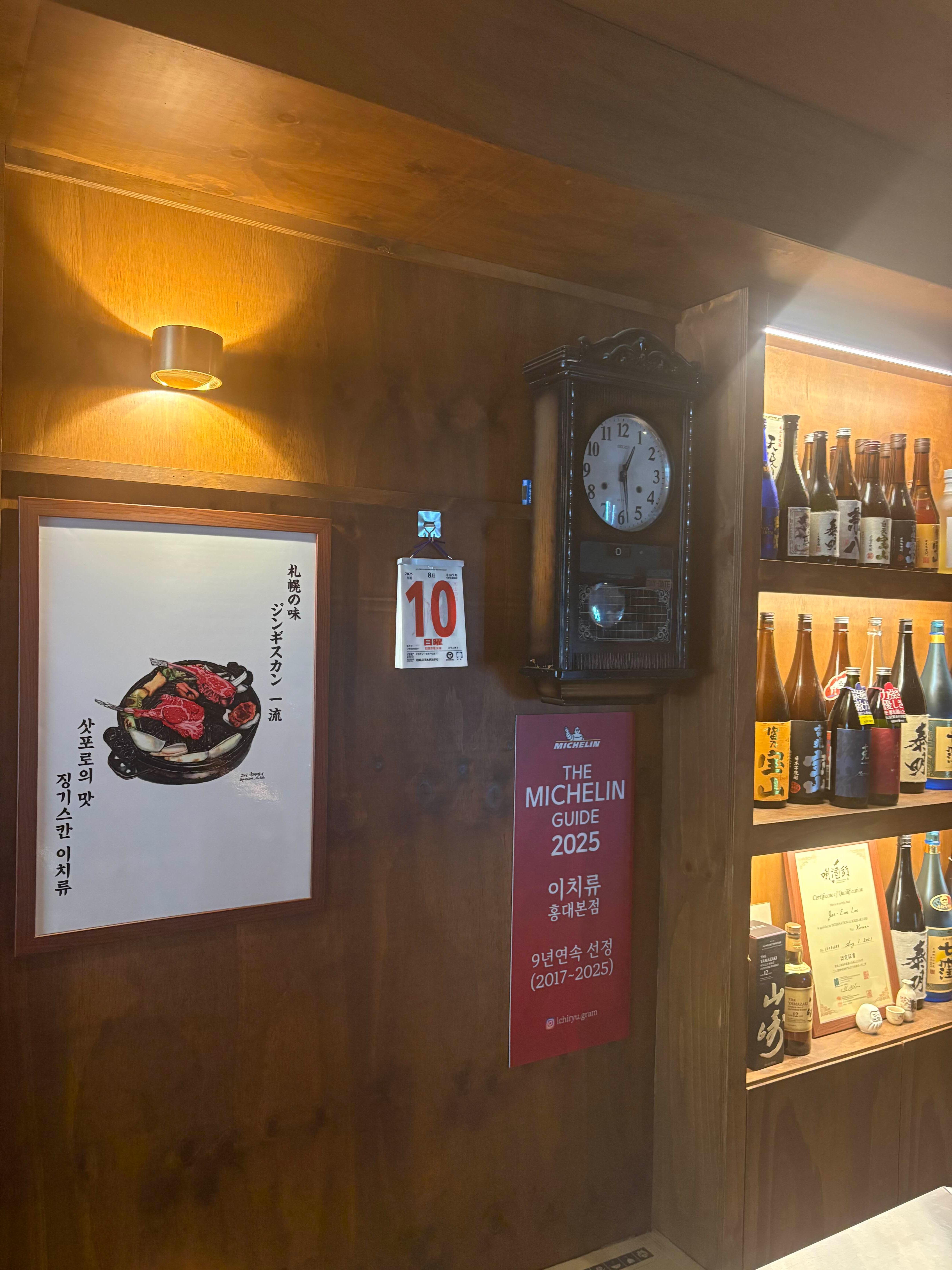 나무 인테리어와 일본식 소품들이 편안한 분위기를 만들고, 벽에는 미쉐린 가이드 인증 패널과 다양한 사케 병이 진열되어 있다. 마치 일본 삿포로의 정통 징기스칸 집에 온 듯한 기분.