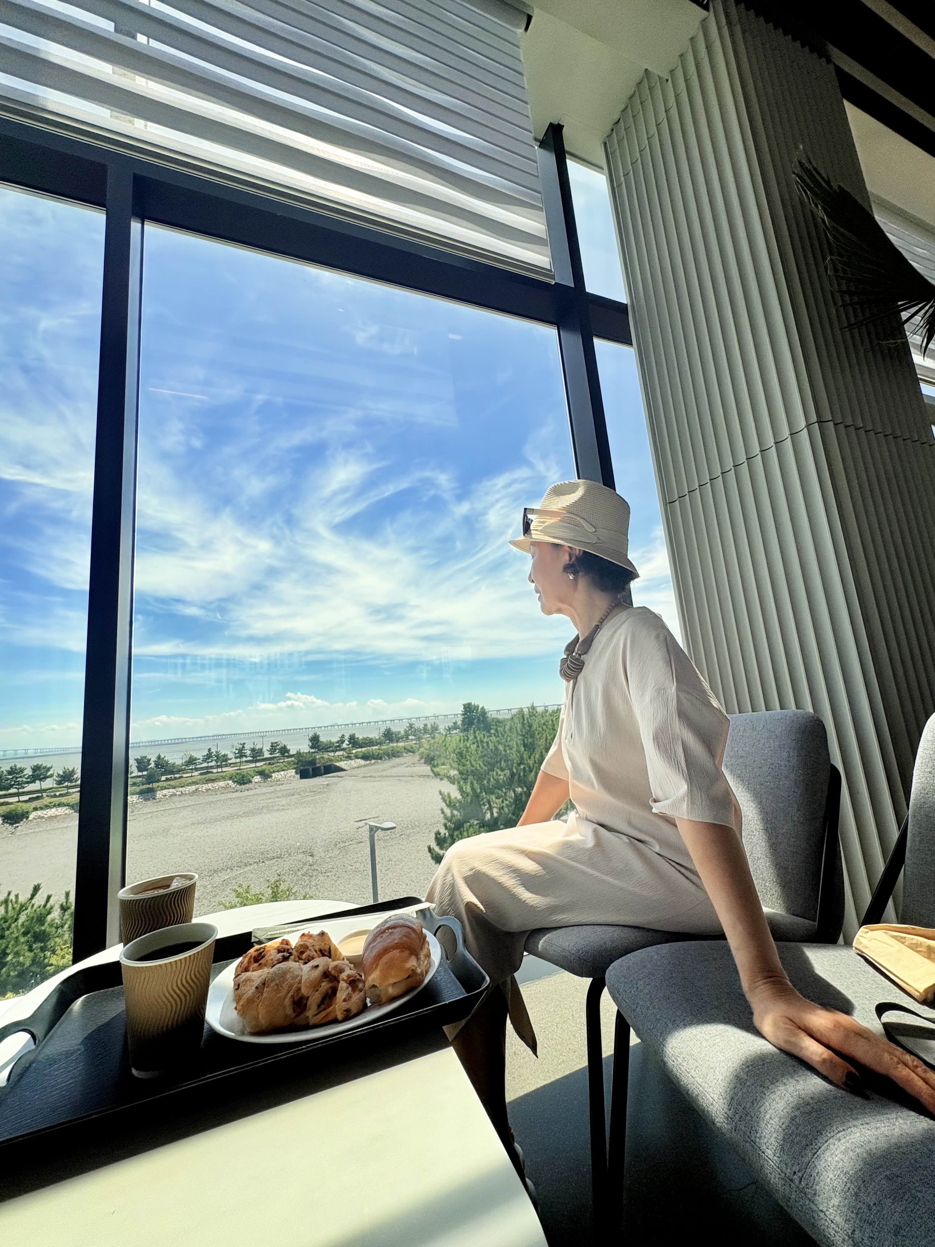 • 2층 & 3층 : 넓고 세련된 실내 좌석 공간. 통유리창을 통해 앉아만 있어도 바다와 인천대교가 한눈에 들어옵니다. 카페 내부는 모던하면서도 따뜻한 톤으로 꾸며져 있어서, 날씨가 궂을 때는 이곳에서 바다를 감상하는 것도 매력적이에요.