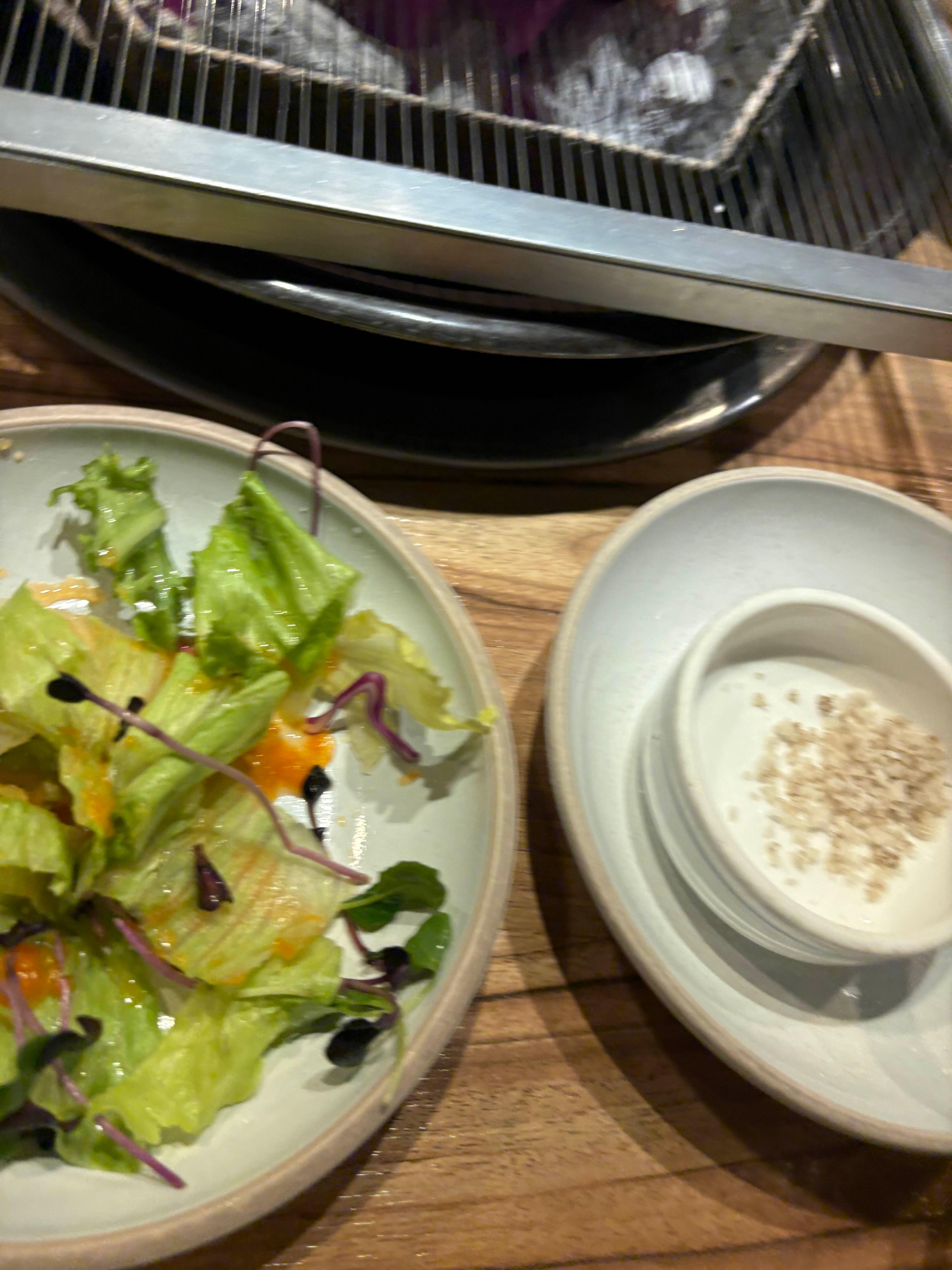 상큼한 샐러드, 파채무침, 묵은지, 마늘, 쌈장, 신선한 쌈 채소까지 기본 반찬도 정갈하게 나옵니다.